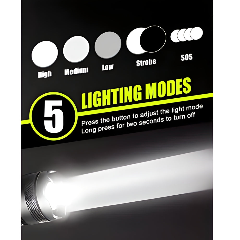 Diseñada para satisfacer todas tus necesidades, nuestra linterna ofrece una variedad de modos de iluminación para adaptarse a cada situación: 💡 alto brillo, 🔅 bajo brillo, 🎇 modo estroboscópico, modo S.O.S y un zoom ajustable para enfocar la luz donde más la necesites. 🌟